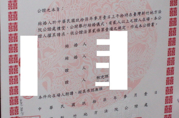 幸好A大律師的女友有帶身分證跟印章,就這樣,在已經印好我名字的結婚證書上,原子筆劃掉我的名字,再寫上A大律師女友的名字,公證也就順利的進行了,正所謂有圖有真相,請看下圖